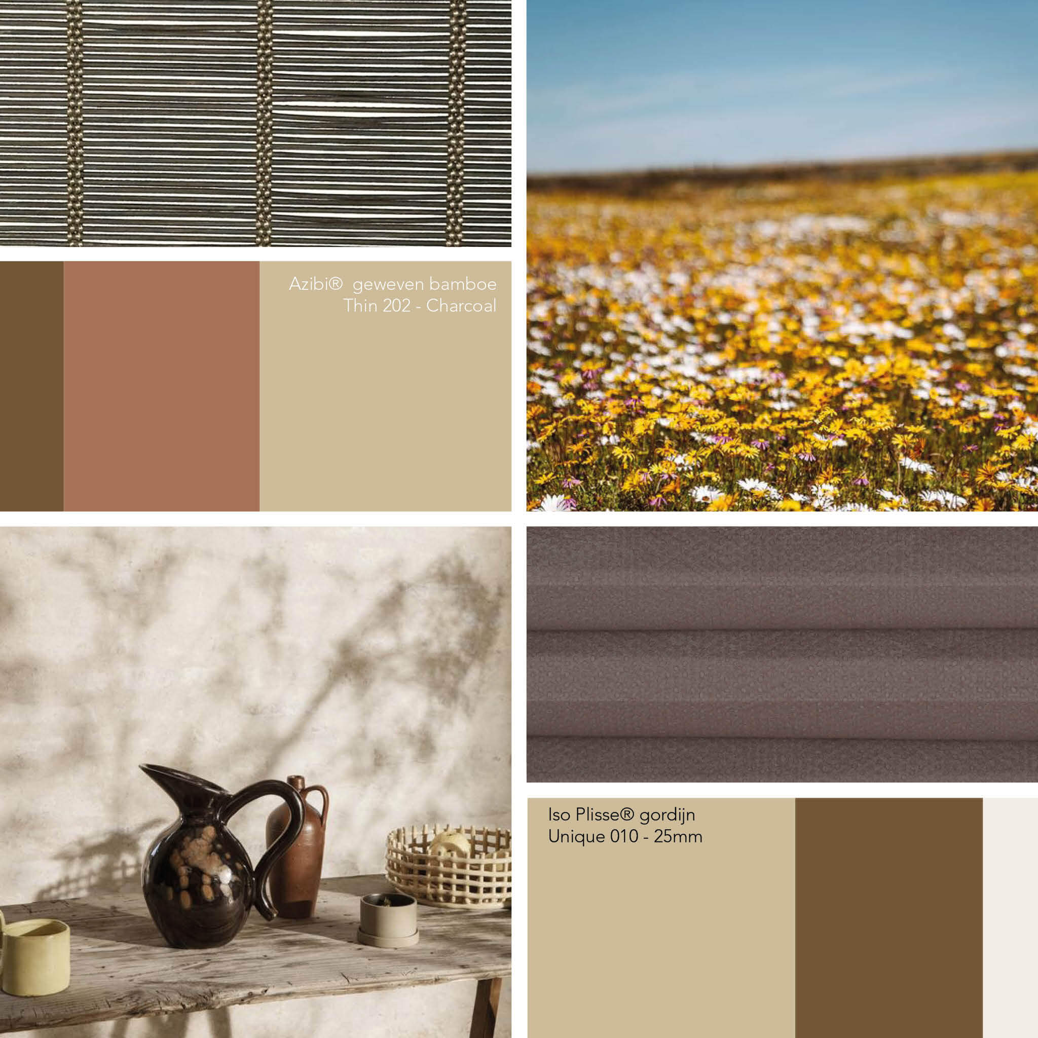 Een landelijk interieur ademt comfort en gezelligheid. Denk aan natuurlijke materialen, zachte kleuren en subtiele texturen. Bij deze stijl passen raamdecoraties zoals vouwgordijnen in zand‑ en taupetinten.
